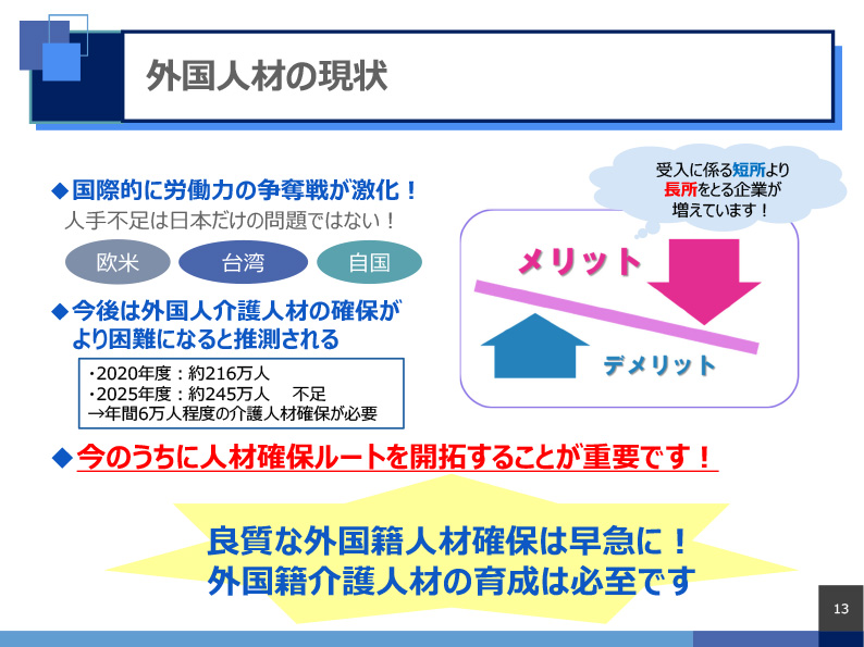 後期高齢者人口の増加に伴い、深刻化する人手不足に対応するため、介護分野においては、国内人材の確保のための取り組みを積極的に行っているが生産年齢人口の減少に伴い人材を確保することが困難な状況にあります。