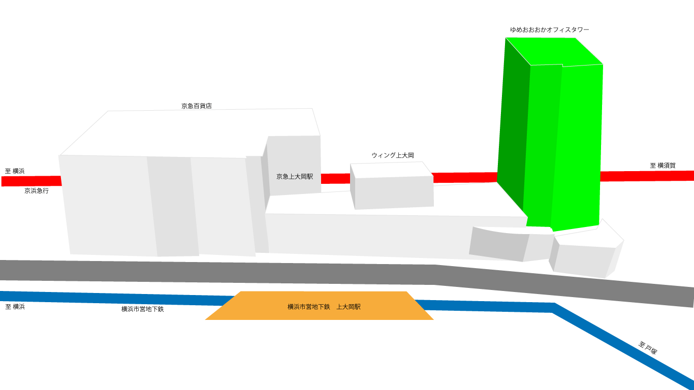 - 京急上大岡駅改札を出て「ゆめおおおかオフィスタワー」連絡通路へお進みください